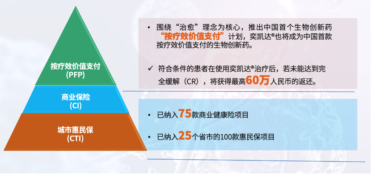自產品上市後,復星凱特積極推動提升CAR-T產品可及可負擔性,依託國家多層次醫療保障體系,探索創新支付方案,包括積極推動納入各省市惠民保清單,並通過深化與TPA (Third Party Administrator)、保險公司的合作,持續提高患者對奕凱達®的可負擔性。